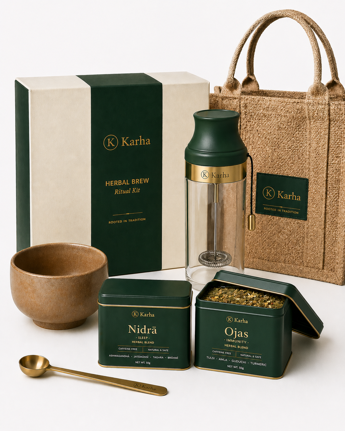 Karha is a cold-brewed, plant-forward elixir that steadies sleep, tempers stress, sharpens focus and sustains vitality — measured to the milligram, never medicinal to the palate.